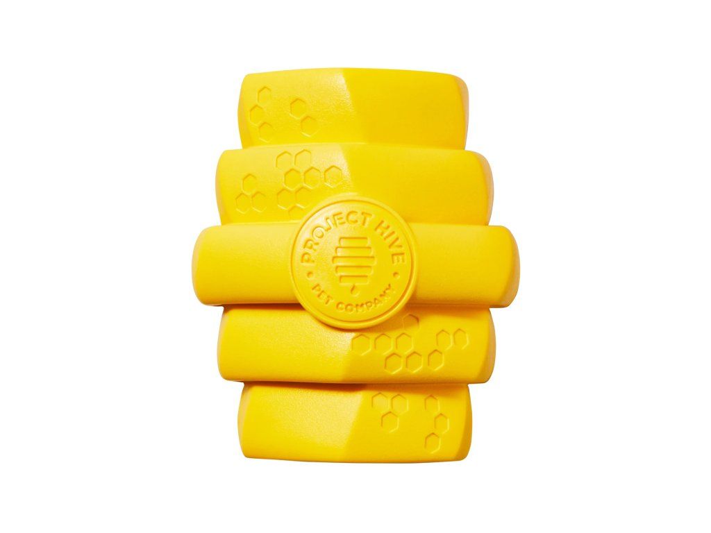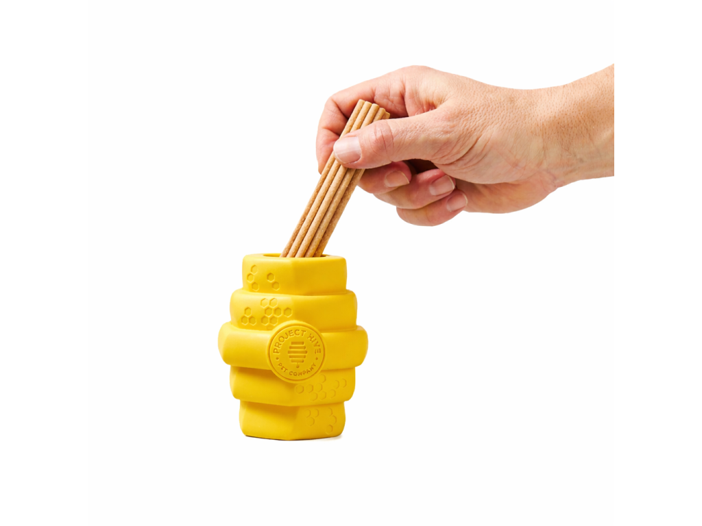 Tip: Insert large Hive Chew Stick Treats in either end of the Yellow Chew Toy for extended play.